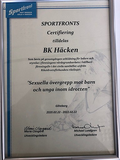 Som ett led i certifieringen har föreningen utvecklat en process att ALLA ungdomsledare i BK Häcken varje år skall visa upp ett utdrag från polisens belastningsregister för att kunna vara ledare i BK Häcken.